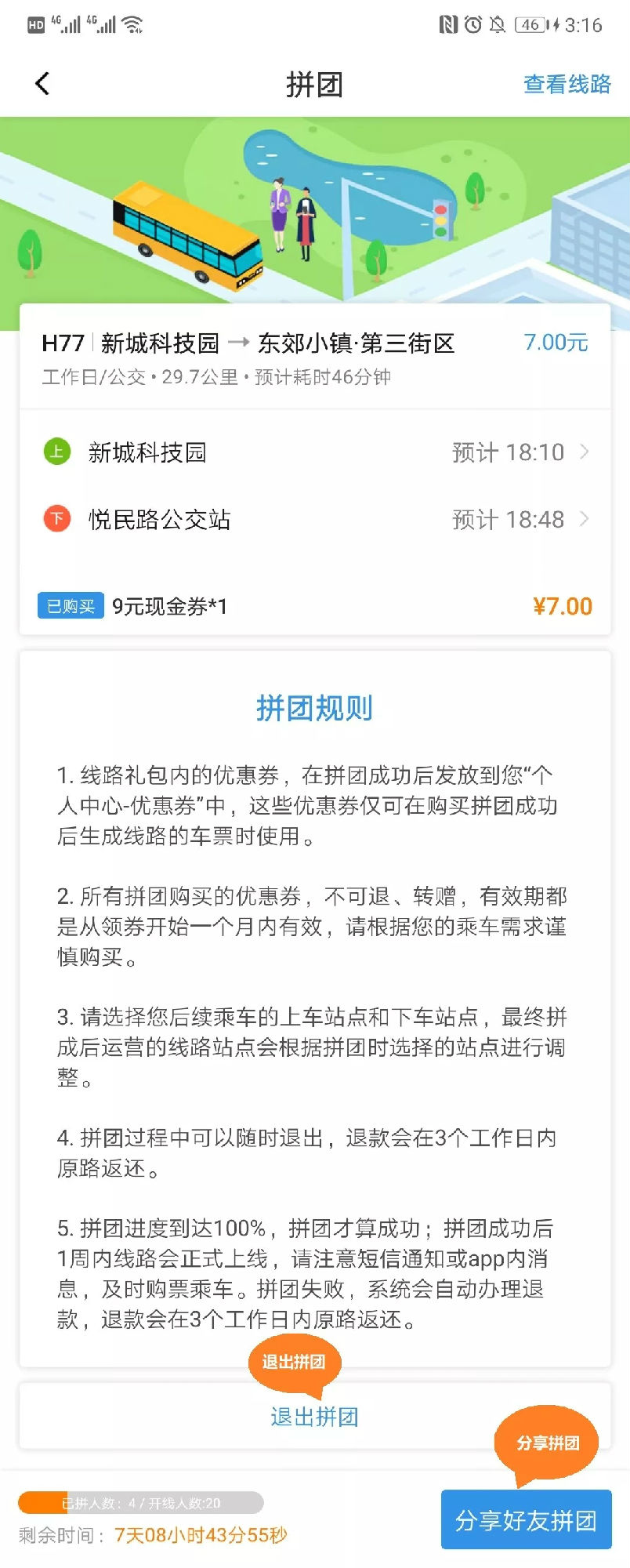 還可以分享鏈接邀請(qǐng)好友一起拼團(tuán)拼團(tuán)進(jìn)度達(dá)到100%之前點(diǎn)擊“退出拼團(tuán)”即可放棄拼團(tuán)系統(tǒng)都會(huì)將票款在3個(gè)工作日內(nèi)